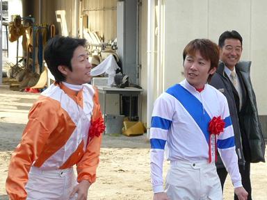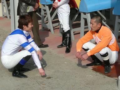 兵庫の木村健騎手と談笑する赤岡騎手。ヤンキー座り?