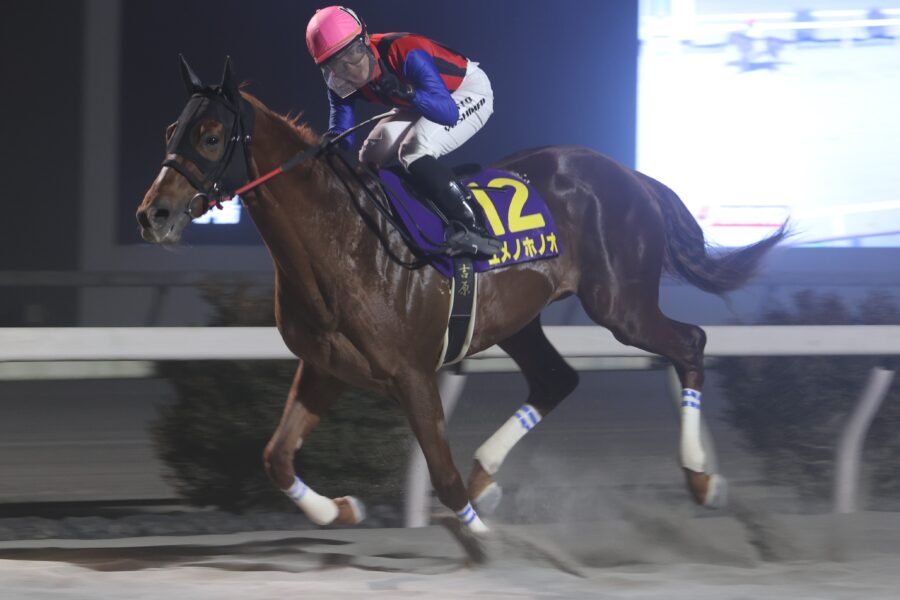 レース序盤、ダノンジャスティス(畑中信司騎手)が先手、ヒカリオーソ(宮川実騎手)、ガルボマンボ(林謙佑騎手)らと続いて人気を集めたユメノホノオ(吉原寛人騎手)は4番手で進みました。2周目向こう正面で各馬一斉に仕掛ける中、本領発揮のユメノホノオがいち早く抜け出し、ガルボマンボ、ロッキーサンダー(赤岡修次騎手)らが追う形で迎えた最後の直線。ユメノホノオは衰え知らずの末脚で後続を寄せ付けず、最後は2着ロッキーサンダーに3馬身差の完勝で高知県知事賞連覇を飾りました。