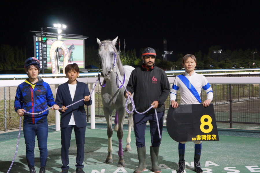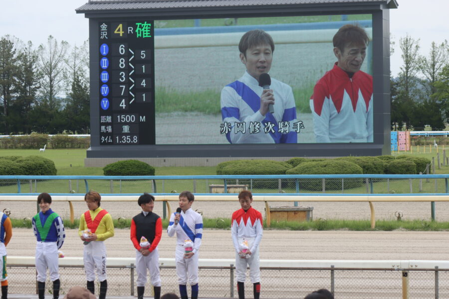 この日は金沢競馬の本格的なナイター開催「百万石かがやきナイター」初日、大勢のファンが競馬場に詰めかけました。シリーズ競走開始前に出場騎手紹介式が行われ、赤岡騎手が「金沢は約1年ぶりの騎乗になります。能登の震災の影響で大変だと思いますが、何とか皆さんに勇気を与えられるような騎乗ができるように頑張りたいと思いますので、宜しくお願いします。」と挨拶をすると、現地のファンからひと際大きな声援があがりました。