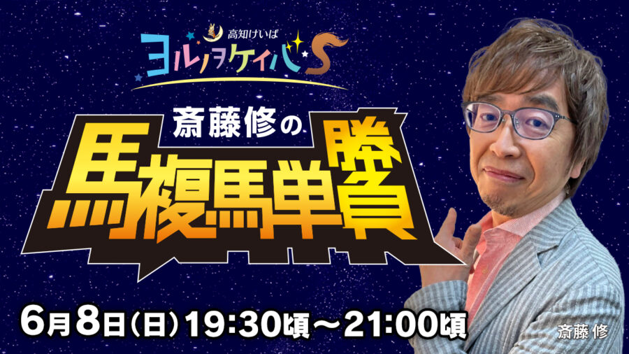 ヨルノヲケイバS~斎藤修の馬複馬単勝負~ 2025/6/7 2025/6/7 ヨルノヲケイバ ゆる~く、楽しく、ドキドキできる馬券予想とレース中継。みんなで高知けいばを楽しみましょう! ヨルノヲケイバS~斎藤修の馬複馬単勝負~【6/8(日)19:30頃~21:00頃】 ヨルノヲケイバでお馴染みの競馬アナリスト斎藤修さんが出演する「ヨルノヲケイバS~斎藤修の馬複馬単勝負~」をライブ配信します。 「なぜ馬複、馬単で絞って勝負する事が多いのか」を解説しながら、最終レース「一発逆転ファイナルレース」を予想します。是非、チャンネル登録してお楽しみください!
