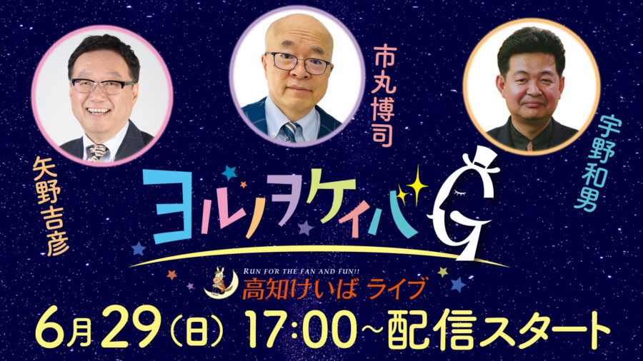 ヨルノヲケイバG~高知けいばライブ?~ 2025/6/28 2025/6/28 ヨルノヲケイバ ゆる~く、楽しく、ドキドキできる馬券予想とレース中継。みんなで高知けいばを楽しみましょう! ヨルノヲケイバG~高知けいばライブ?~【6/29(日)17:00頃~21:00頃】 競馬界で長きにわたって活躍している方々が出演するヨルノヲケイバGを生配信。 競馬にまつわる思い出話やベテランならではの馬券予想を披露しながら、ゆる~い競馬番組を配信いたします。 是非、高知けいばのYouTubeチャンネルを登録してお楽しみください!
