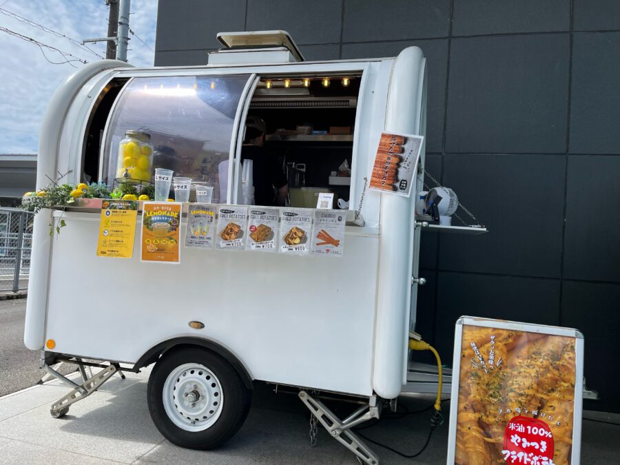 小さなトレーラーカフェ。冷たいレモネードやチュロスなどを販売します。