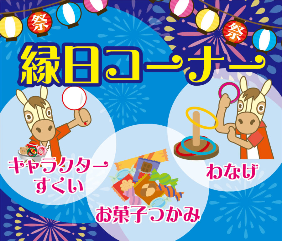 乳幼児休憩所まえにて、14時から「キャラクターすくい」、「お菓子すくい」、「 わなげ」に参加できる縁日コーナーを開催します。