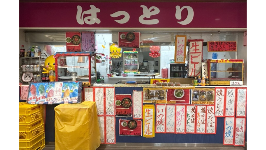 はっとりは、いか焼きやおでん、焼きそばにおにぎりなど豊富なラインナップ。