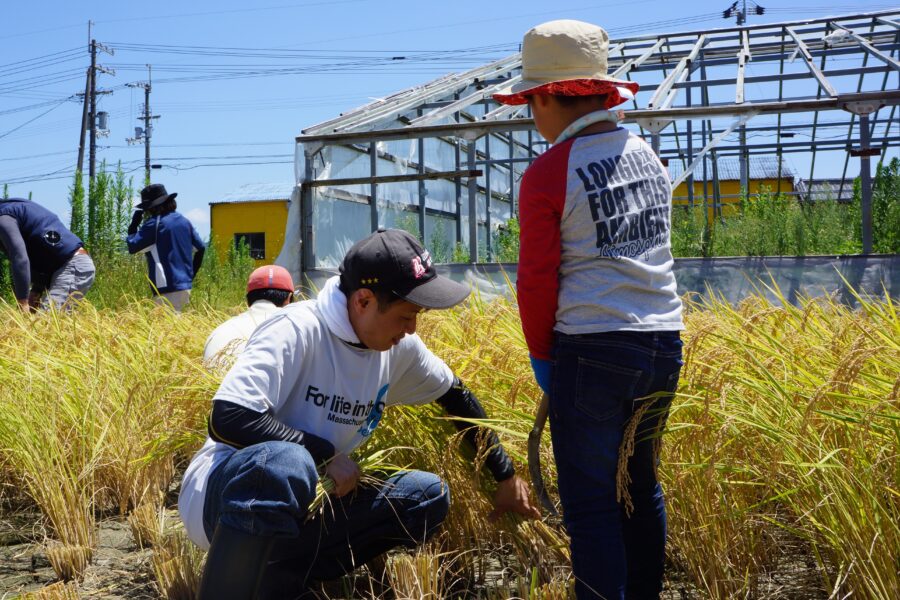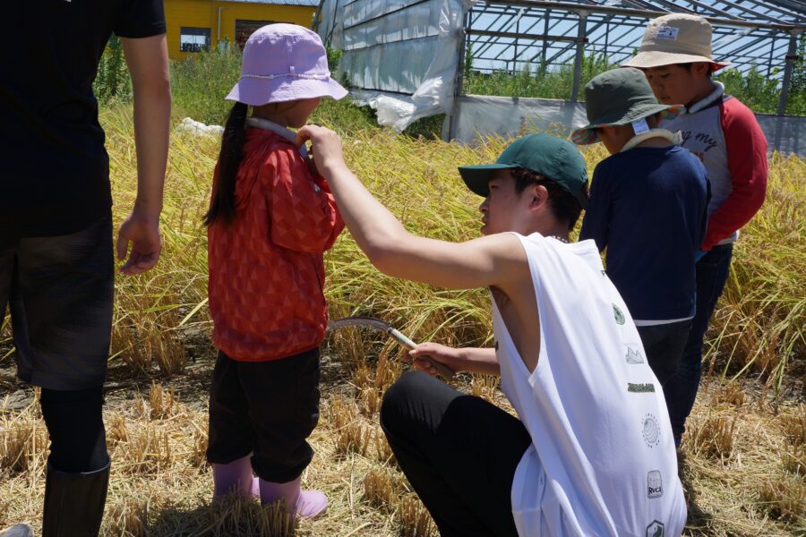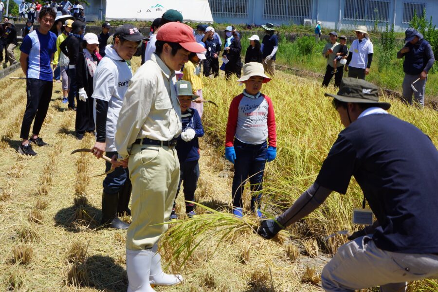 参加した子どもたちと騎手がグループに分かれて鎌を使っての稲刈りと、コンバインを使っての収穫を行いました。手刈りの際に子どもたちが怪我をしないよう、また暑さで体調を崩さないよう気遣う騎手たちと、汗を流しながら一生懸命刈り取り作業を行う子どもたちの姿がとても印象的でした。
