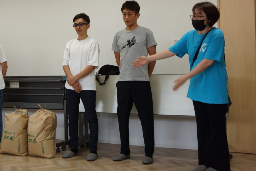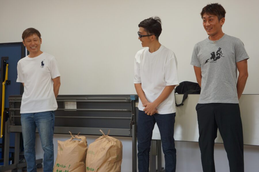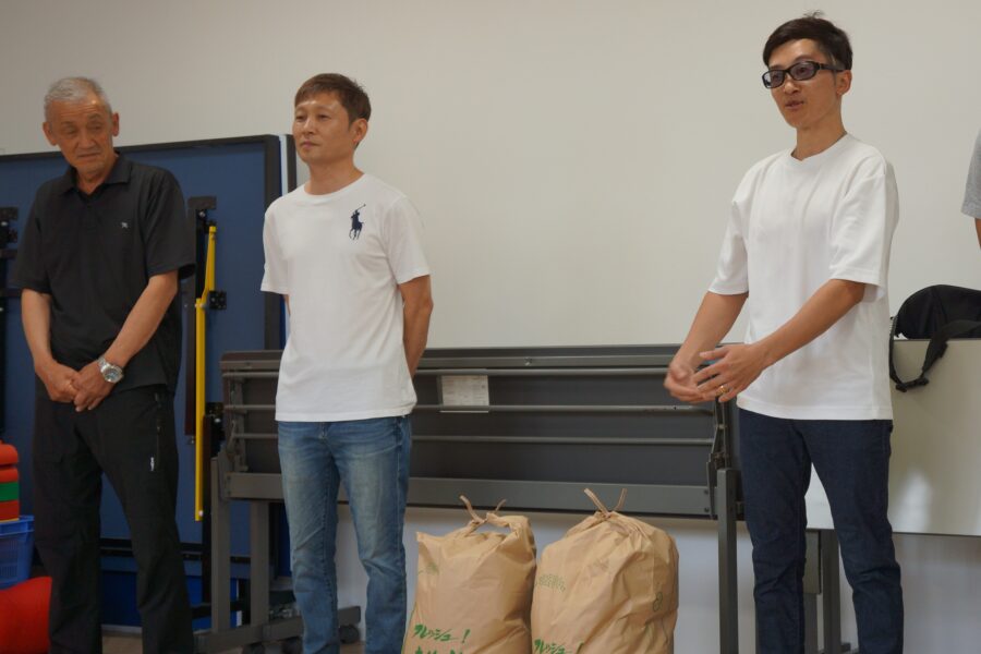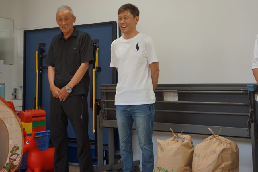 坂本副施設長からは「今大変お米も貴重になっていますが、それだけではなく園からも米作り体験に参加させてもらった子がいて、本当に貴重な体験をさせていただきました。お米が育って出来上がるまでにこんなに手間がかかっているということも知れたので、そうしたこともこのお米をいただきながら子どもたちと話題にしたいです。子どもたち白米が本当に大好きで、それも皆さんで育てた新米ということなので、大切にいただきたいと思います。」とコメントを頂きました。