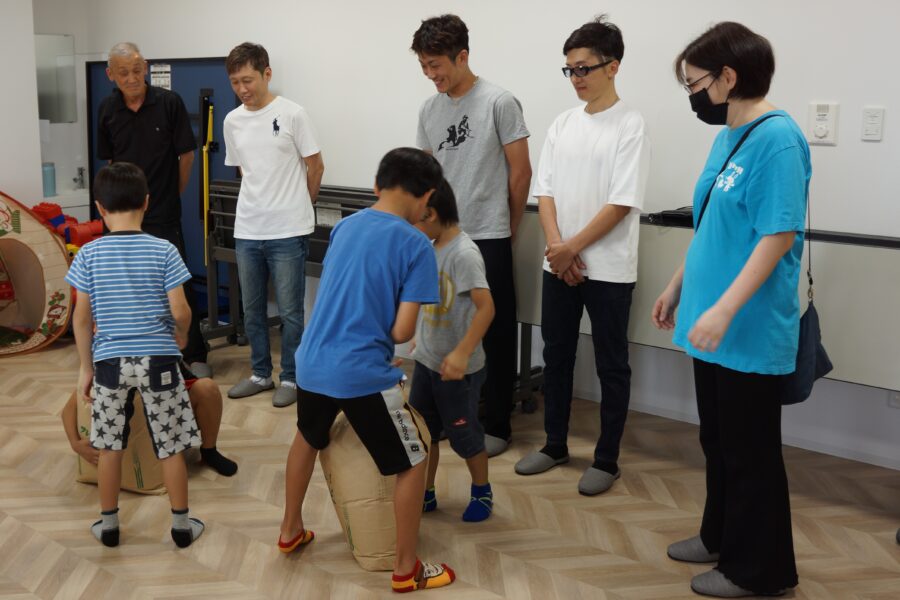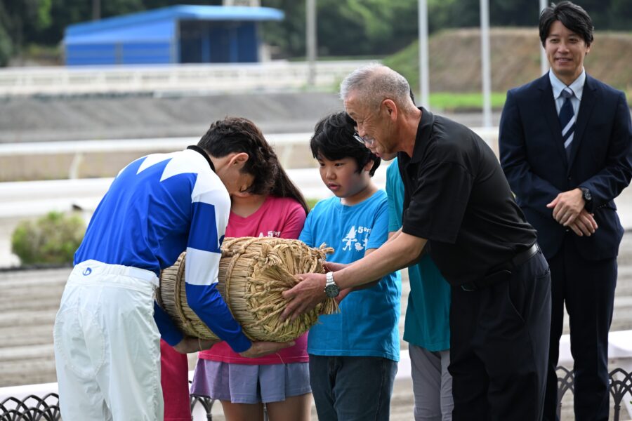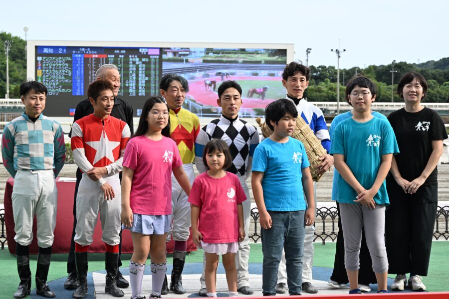 騎手会からは赤岡修次騎手会長、宮川実・永森大智両副騎手会長が高知聖園天使園を訪れ、吉本正仁様、高知市こども劇場の霜田理事長らとともに園の子どもたちへと新米約60㎏を手渡しました。