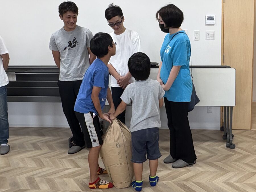 関係者に感謝のお礼を伝えた後、受け取った米袋を皆で力を合わせて持ち上げようとする子どもたち、関係者の想いが詰まったずっしりとしたお米の重みを感じていました。