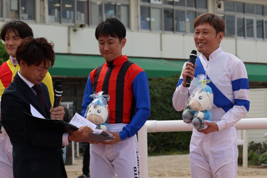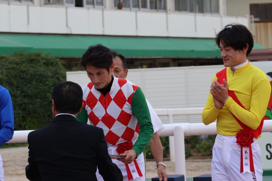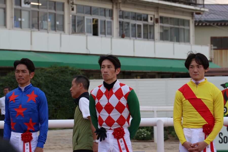 9月24日(水)、園田競馬場で実施された通算2,000勝以上の騎手によって計3競走のポイント制で争われる騎手招待競走「第32回 ゴールデンジョッキーカップ」に、高知から赤岡修次騎手と永森大智騎手が出場しました。