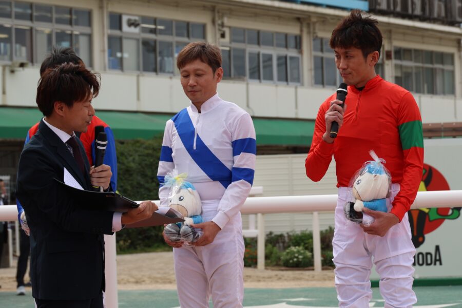 初戦、2戦目を制した戸崎圭太騎手(JRA)と矢野貴之騎手(大井)が共に35点のポイントトップで迎えた最終戦。3コーナー過ぎで好位から先頭に立った笹川翼騎手(大井)騎乗のタンバブショウがそのままの勢いで勝利を掴みました。後方から追い上げた赤岡騎手騎乗のサンライズスコールが6着、同じく追い上げた永森大智騎手騎乗のツキムスビは7着の結果となりました。