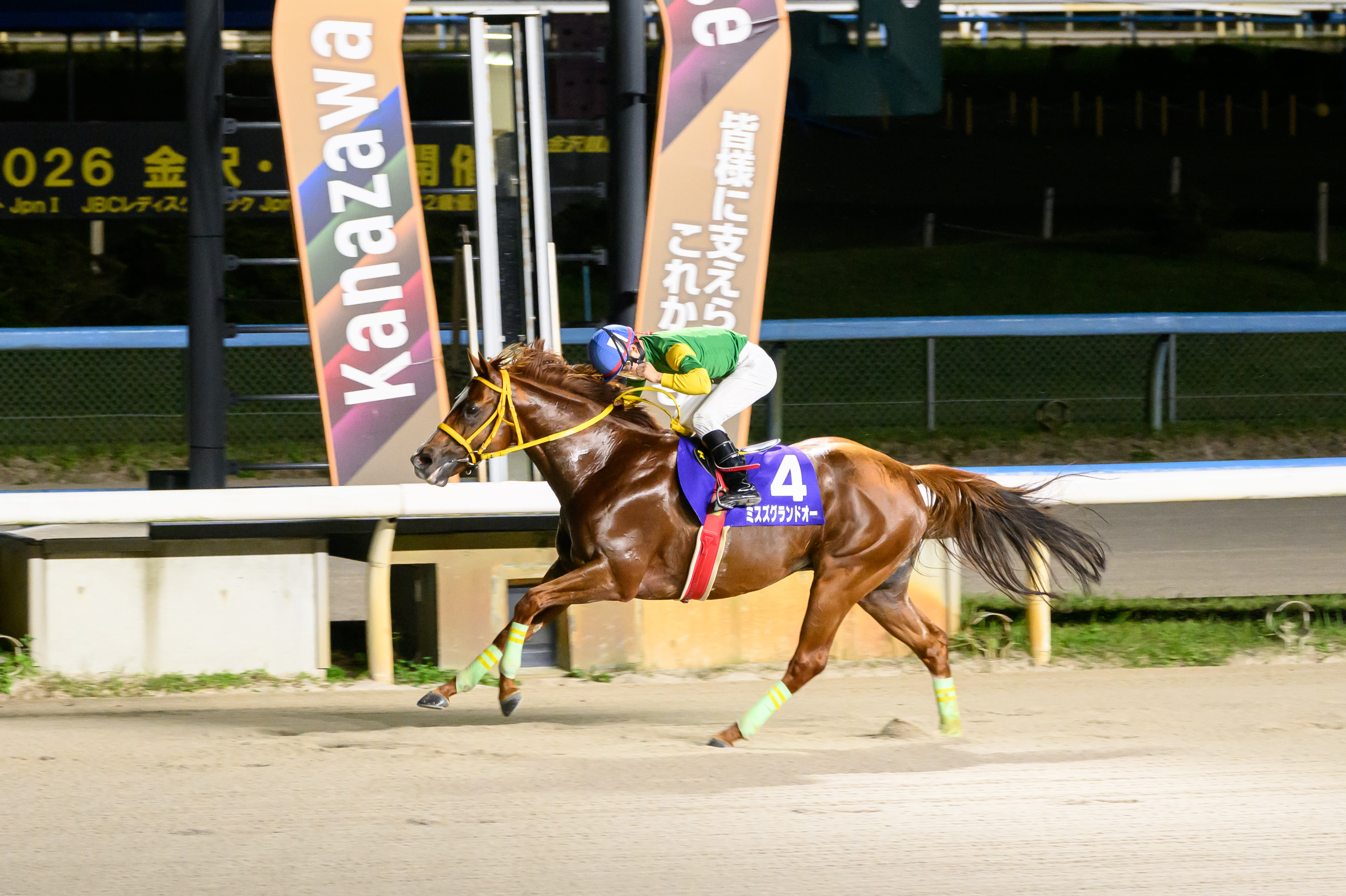 10月25日(土)、金沢競馬場で実施された「第23回 金沢スプリントカップ」(3歳以上・ダート1,400m)で、高知・目迫大輔きゅう舎所属のミスズグランドオー号(塚本征吾騎手:愛知)が勝利しました。