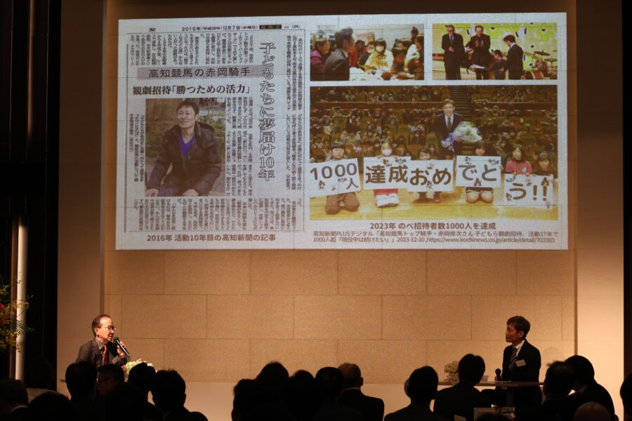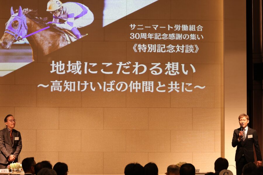 赤岡修次騎手が中心となって行われている高知市こども劇場年末招待公演や、稲作実行事業などで繋がりのある高知市特定非営利活動法人 高知市こども劇場 高橋美佐子様の進行のもと、サニーマート労働組合初代中央執行委員長 武政澄夫氏と、赤岡騎手による‟高知けいばの歴史と歩み”を中心に特別記念対談が行われました。