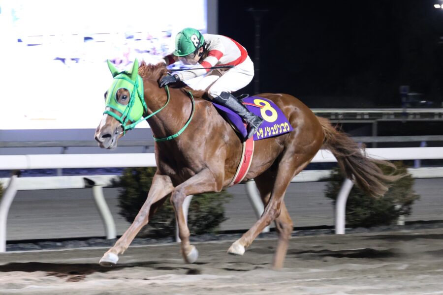 レース序盤、サンフラワームーン(吉原寛人騎手)が先行、ザガラ(兵庫・吉村智洋騎手)、クスダマ(永森大智騎手)、キッサキ(赤岡修次騎手)らが続いて先団を形成、やや離れてトサノシュジンコウ(多田羅誠也騎手)らが続きました。3コーナー過ぎ、後続を離しにかかるサンフラワームーンがペースを上げ、じわじわとリードを広げつつ最終コーナーを通過。逃げ切りを狙うサンフラワームーンに直線終盤で一気に追い上げたザガラとトサノシュジンコウが迫り、執念で伸びたトサノシュジンコウが抜け出し2着ザガラに1.5馬身差で勝利しました。