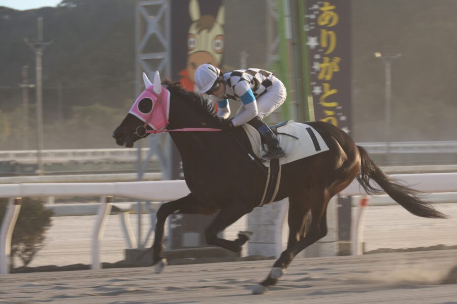 [令和7年度 第12回高知競馬第4日]第3競走において、郷間勇太騎手騎乗のシーザソング号が勝利し、管理する西川敏弘調教師が地方競馬通算100勝を達成しました。