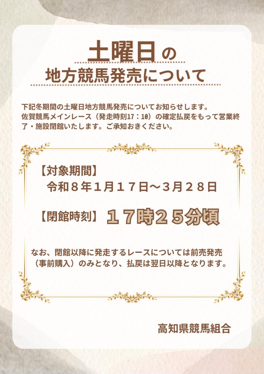 高知競馬 土曜日の地方競馬発売について 2026/1/16 2026/1/17 発売情報 令和8年1月17日(土)より、高知競馬場、パルス宿毛、パルス藍住での土曜日の他地区地方競馬発売については、佐賀競馬メインレースの確定払戻時刻までの前売発売(売り逃げ)運用となります。パルス高知では、10時から17時までの払戻及び返還対応のみとなります。