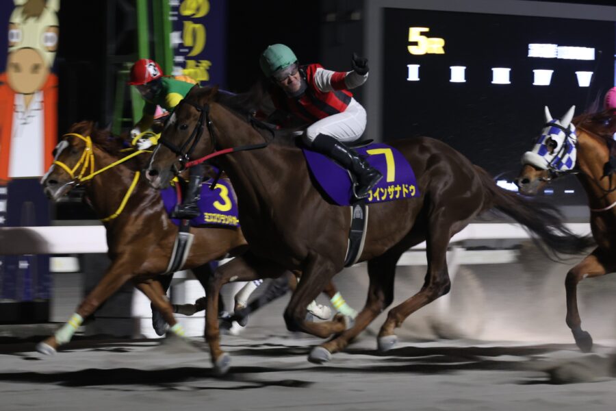 レース序盤、浦和ポリゴンウェイヴ(北海道・落合玄太騎手)が先行、ロードレイライン(井上瑛太騎手)、ミスズグランドオー(愛知・塚本征吾騎手)と続いて先団を形成。ウインザナドゥ(宮川実騎手)は中団の後方で進行。ハイペースで進むポリゴンウェイヴにミスズグランドオーが外から並びかけつつ最終コーナーを通過。僅かに抜け出したミスズグランドオーにポリゴンウェイヴが懸命に食らいつく中、最内から外に持ち出したウインザナドゥがゴール前で快心の末脚を発揮。一気に差し切り勝ちを決め、鞍上の宮川実騎手が渾身のガッツポーズで歓びを表現しました。