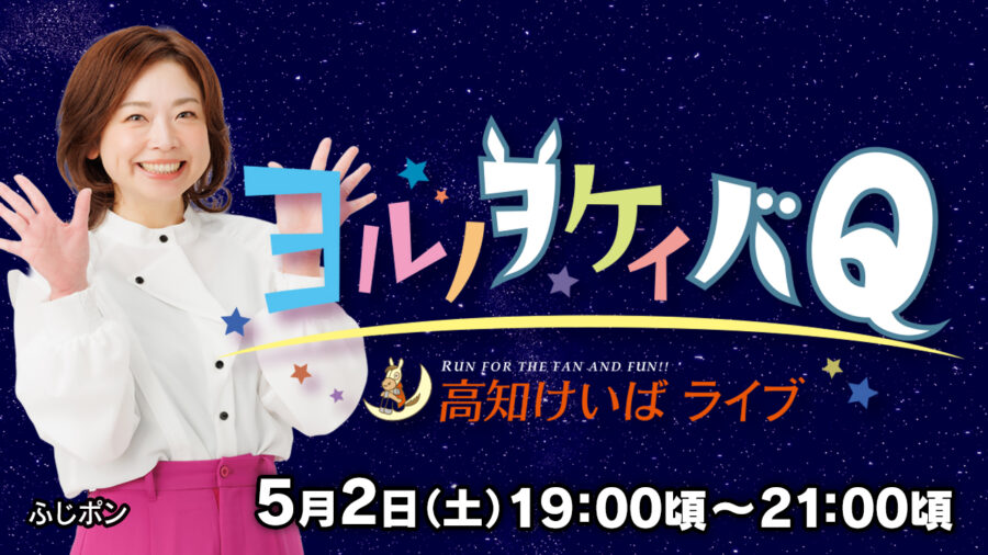 ヨルノヲケイバQ 2026/4/26 2026/4/26 ヨルノヲケイバ ゆる~く、楽しく、ドキドキできる馬券予想とレース中継。みんなで高知けいばを楽しみましょう! ヨルノヲケイバQ【5/2(土)19:00頃~21:00頃】《ふじポン》 是非、高知けいばのYouTubeチャンネルを登録してお楽しみください!