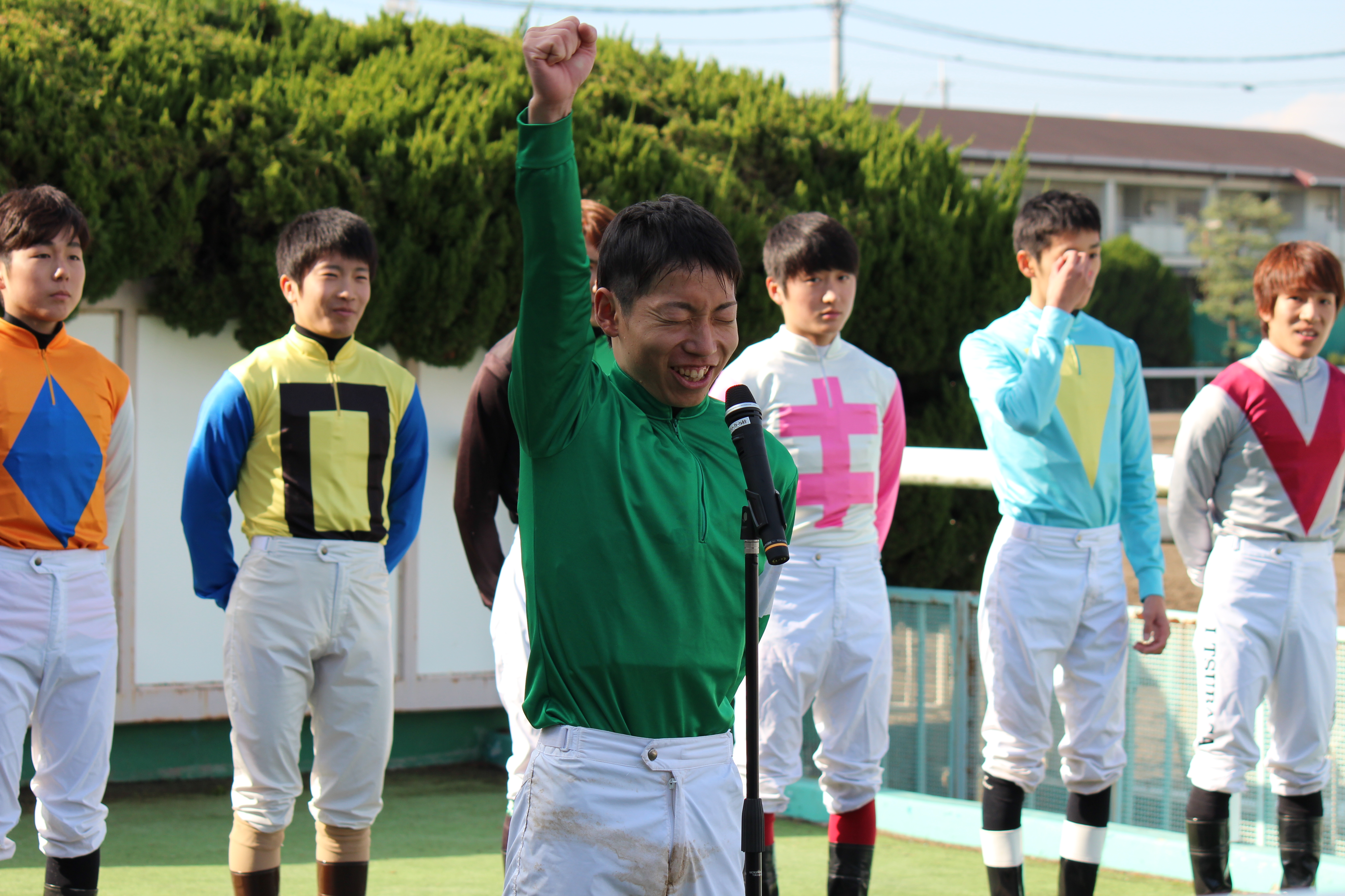 地方競馬西日本地区で第4位の松木大地騎手。紹介式では、家族や地元の応援団に向けて、「みんなのために頑張ります。」と意気込みを語りました。![]()