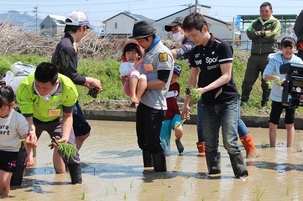 騎手と子どもの田植え体験2017 2017/4/5 今週の高知けいば, ブログ 高知けいば所属騎手の春の恒例行事になった「騎手と子どもの田植え体験」が4月4日(火)に行われました。 南国市の吉本正仁さんの田んぼで,騎手と高知市子ども劇場の子供たちが3グループに分かれ,田植えと南国市消防署と消防団の協力による放水体験しました。 騎手・子ども達ともに田んぼの感触を確かめたり,放水を楽しんでいました。 南国市の農家の方が提供していただいたお赤飯を騎手と子ども達でいただきました。 天気も良く,騎手・子ども達ともに気持ちよく汗をかきながら楽しんでました。騎手の皆さんお疲れ様でした。
