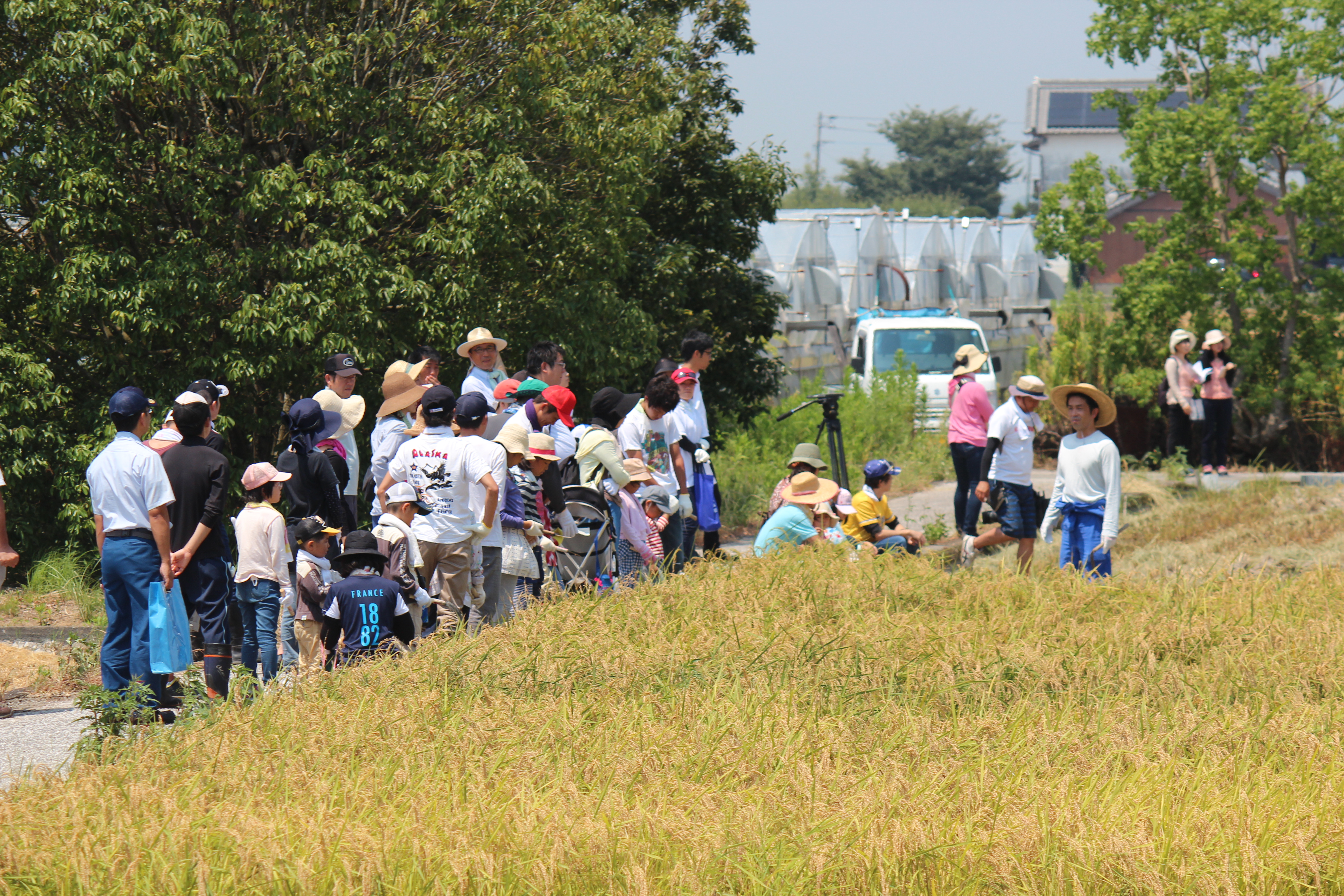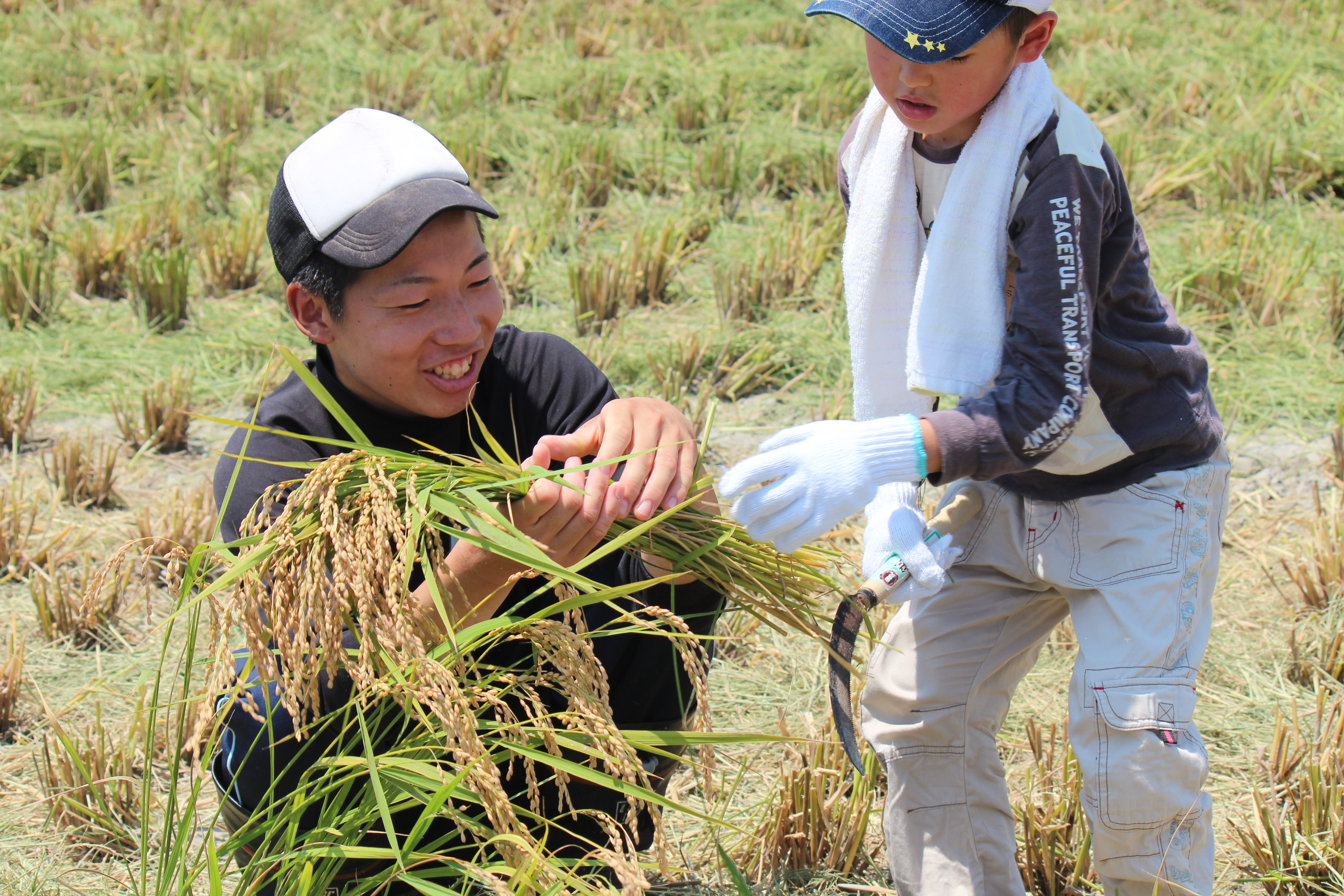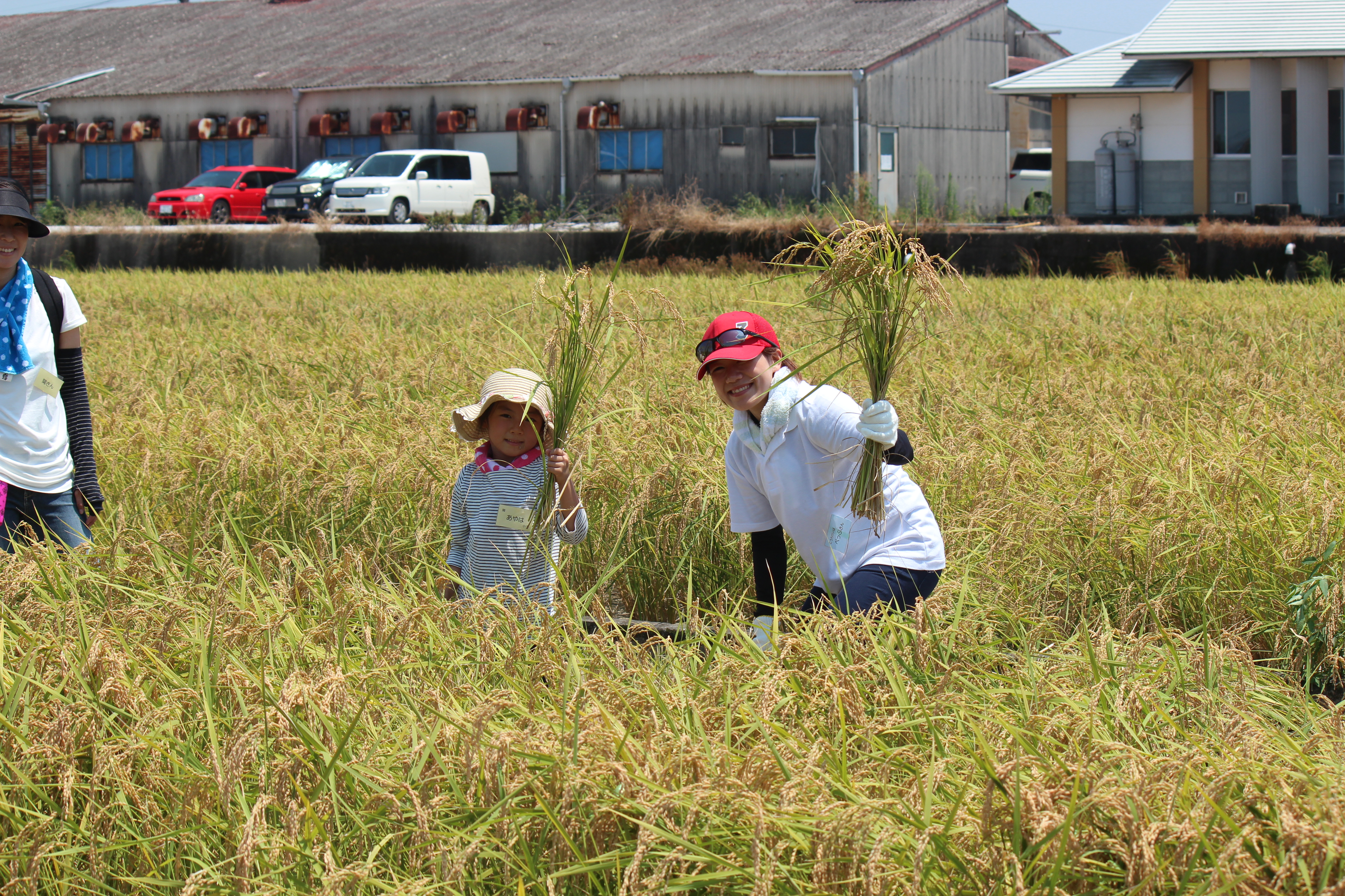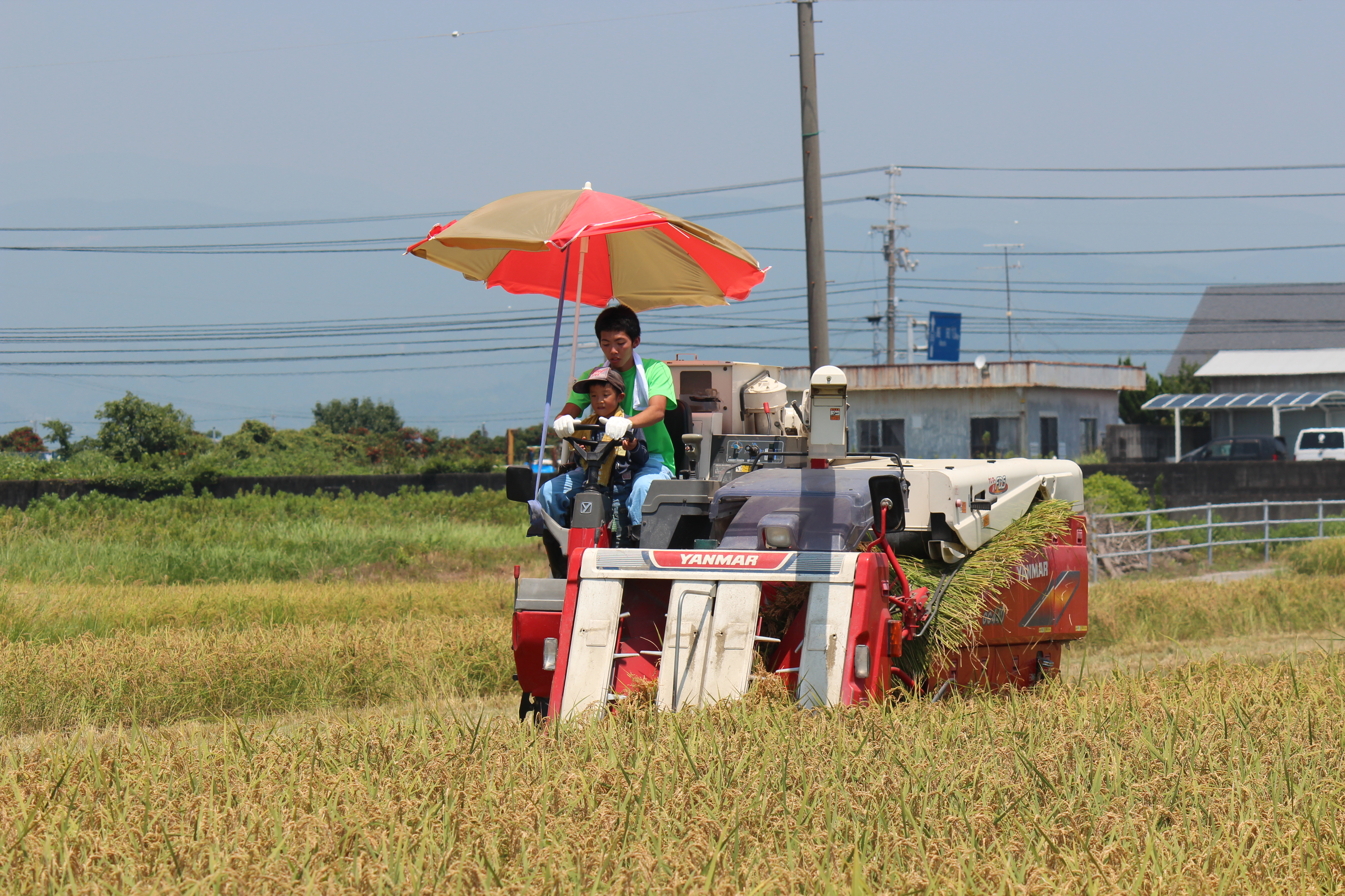 騎手と子どもの稲刈り体験2015 2015/8/9 今週の高知けいば, ブログ 8月4日に高知競馬所属騎手が高知市こども劇場さんと一緒に南国市農家の吉本さんの田んぼでファーストキッス収穫祭が行われました。今年の4月に田植えをした苗が立派な稲穂になっていました。 今年は天気も良く絶好の稲刈り日和です。20人の騎手が鎌を手にし、高知市こども劇場の子どもたちとペアを組み、慣れた手つきで稲刈りをしていました。コンバインの操作も慣れたものです。
