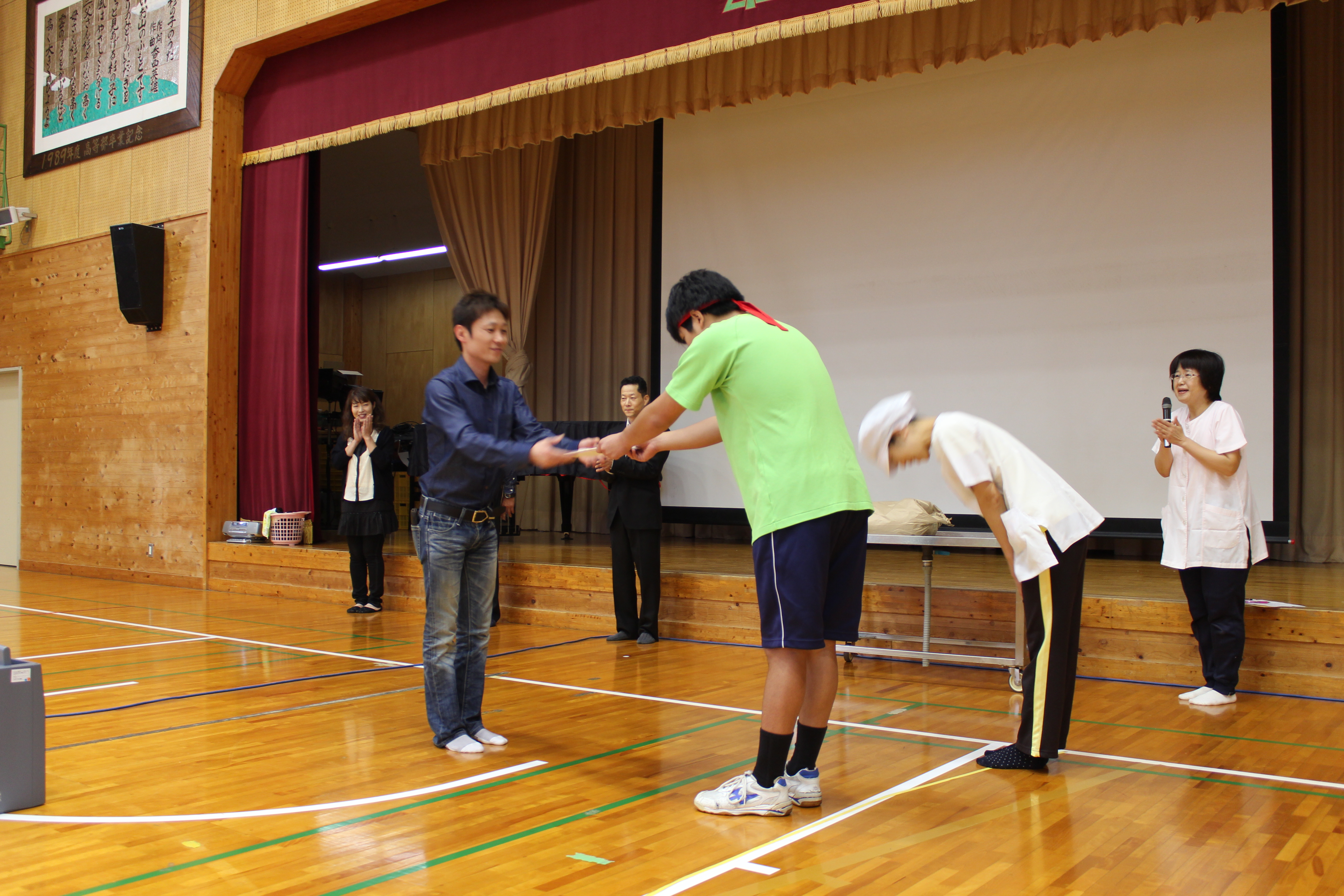 新米「ファーストキッス」を寄贈させていただきました 2014/9/23 今週の高知けいば, ブログ この春、高知けいば所属騎手が、親交の深い南国市農家の吉本様、高知市こども劇場様とともに、子ども達と一緒に田植えをしましたお米「ファーストキッス」。9月22日は西川騎手、赤岡騎手、吉本さん、こども劇場高橋さんとともに高知市立養護学校様を訪問し、新米「ファーストキッス」を寄贈させていただきました。 <訪問の様子> みんな「ファーストキッス」を食べて、元気に育ってくださいね。
