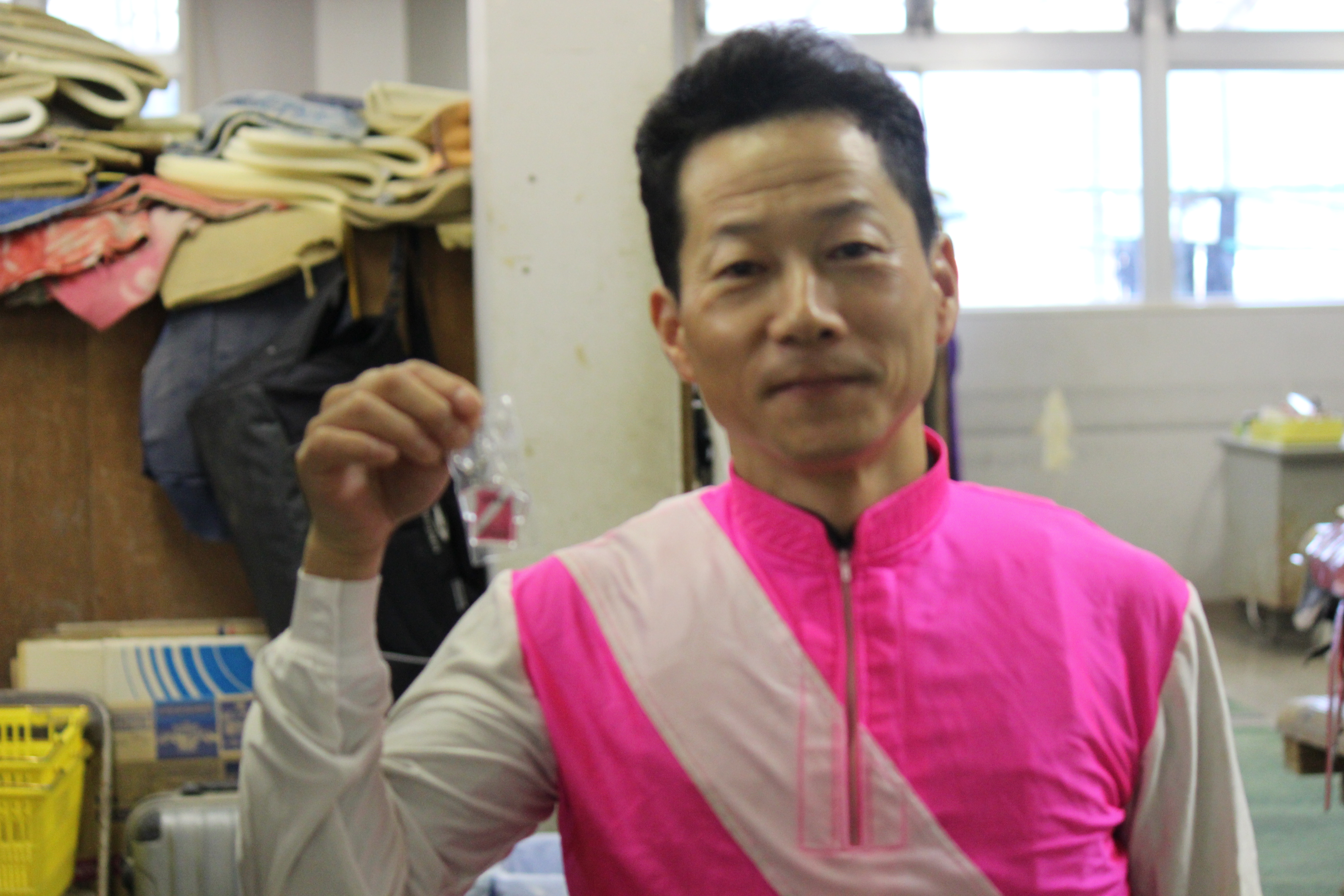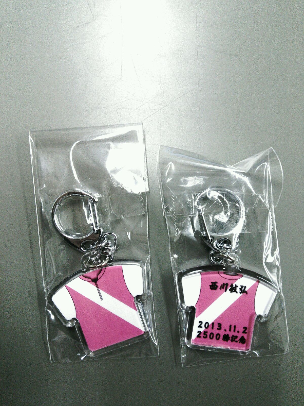 西川敏弘騎手2500勝達成記念キーホルダー 2013/11/16 今週の高知けいば, ブログ 明日11月17日(日)第7R本馬場入場後(19:10頃から)に中央スタンド前ステージで行われる西川敏弘騎手2500勝表彰式でファンの皆様にプレゼントされる記念キーホルダーが完成しました! 西川騎手ご本人も大満足(!?)の仕上がりになっておりますので、皆様ご来場のうえ、西川騎手からカラーボールをゲットしてください。