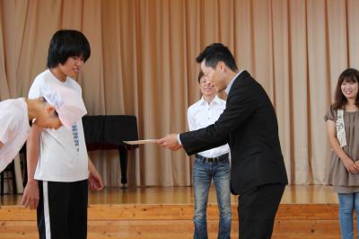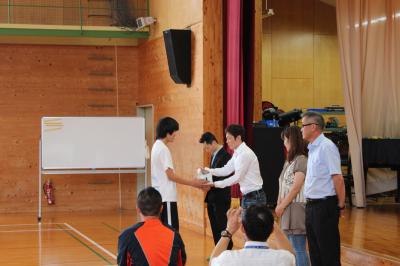 高知市立養護学校様に新米「ファーストキッス」を寄贈させていただきました 2013/9/13 今週の高知けいば, ブログ 騎手と子どもたちが田植え、稲刈りをした新米「ファーストキッス」。9月9日は西川騎手、赤岡騎手、南国市農家の吉本さん、こども劇場の高橋さんとともに高知市立養護学校様を訪問し、とれたての新米を寄贈させていただきました。新米はその日の給食で生徒さんに振舞われたそうです。生徒さんたちからは手作りの縫製品をお礼にいただきました。ありがとうございました。<訪問の様子>