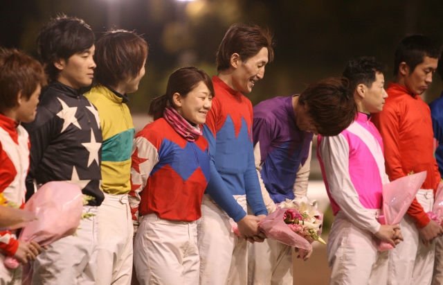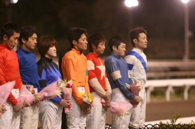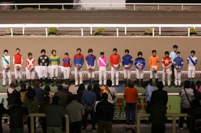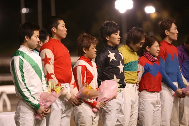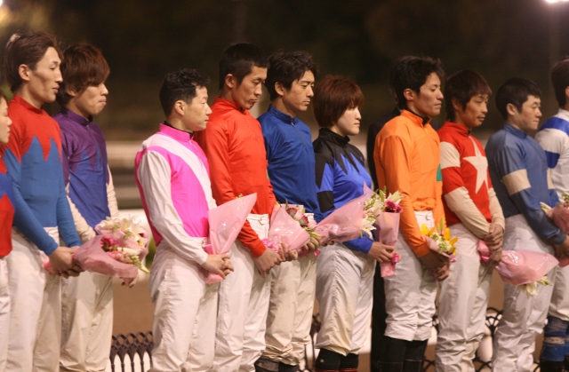 (右から、赤岡騎手、石本騎手、上田騎手、岡村騎手、下村騎手、中西騎手、永森騎手、西川騎手、西森騎手、西山騎手、別府騎手、宮川浩騎手、宮川実騎手、目迫騎手、山頭騎手、山中騎手)![]()