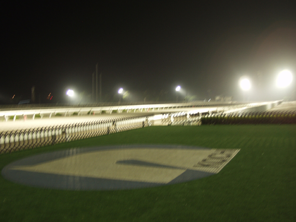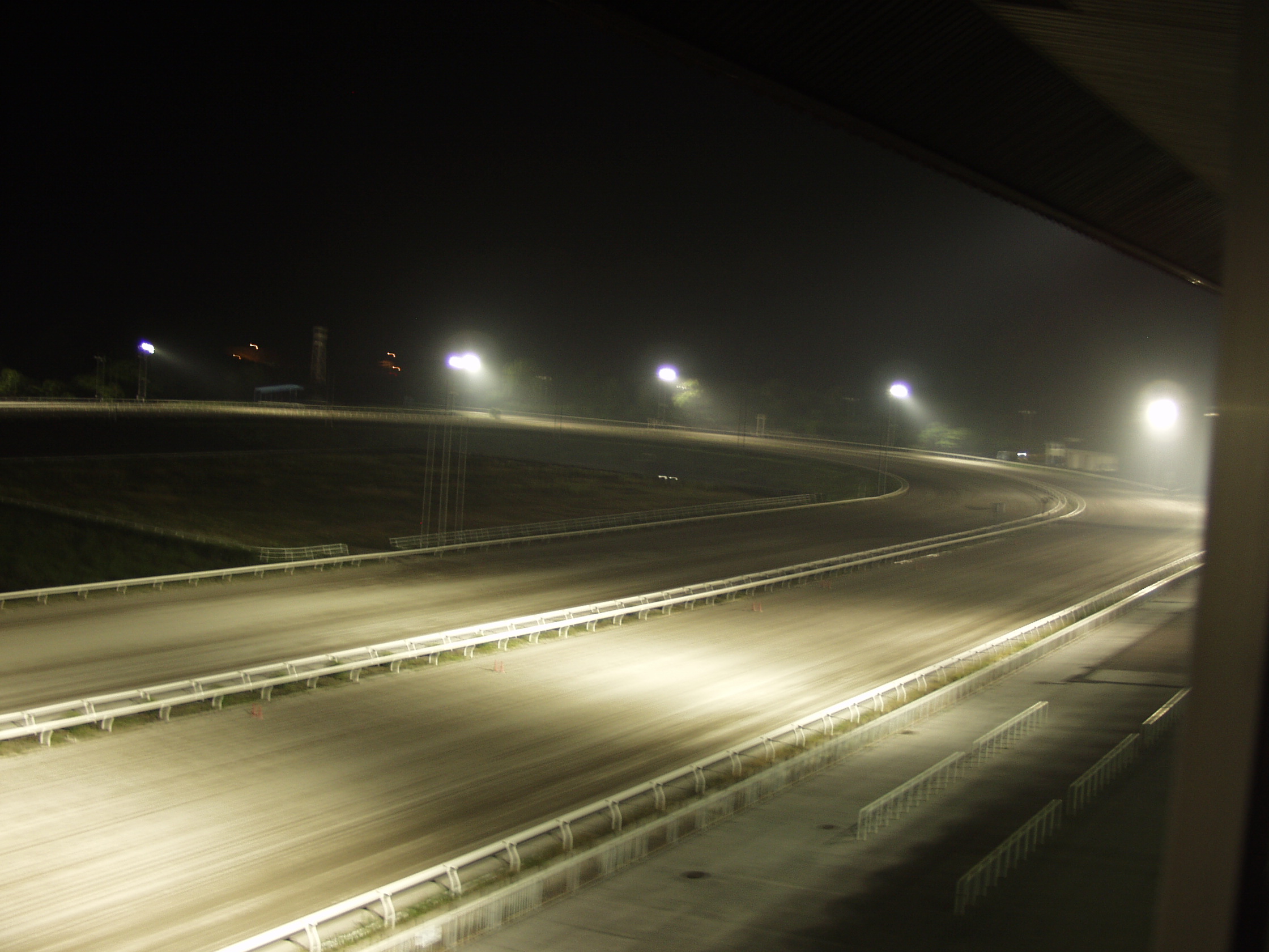 ナイター照明試験点灯 3 2009/6/16 今週の高知けいば, ブログ ステージ上から。 次は来賓室1から。ワタクシ、窓を拭こうと思いました。この明るさで、攻め馬を行うそうです。試験点灯中、雷がごろごろ鳴っておりました。ワタクシ、頑張ろうとか興奮すると雨を呼ぶと事務所で有名ですが、今回興奮しすぎ、小さな嵐を呼んでみました。えへ。