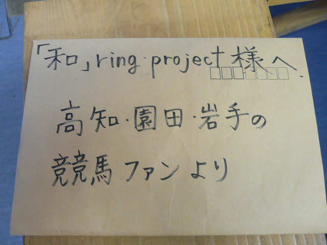 高知競馬場・園田競馬場・水沢競馬場で行ったチャリティー販売の収益、並びに各競馬場でお預かりした支援金(計15万5500円)を、岩手県釜石市や大槌町を中心に活動する「和」RING-PROJECTさんにお届けしました。