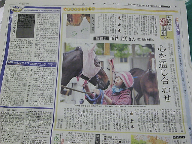 2月7日(土)高知新聞 夕刊 2009/2/8 その他 平成21年2月7日(土)の高知新聞夕刊『ただ今修行中』に、厩務員の山谷五月さんが出ています。 高知新聞の方には、丁寧に取材をしていただきました。五月さんは、お仕事をしながら取材を受けてくれました。見学しながら、私には続かないなと思いつつ、馬達に言葉掛けしながら怒ったり笑いかけたりちょっと羨ましいですね~