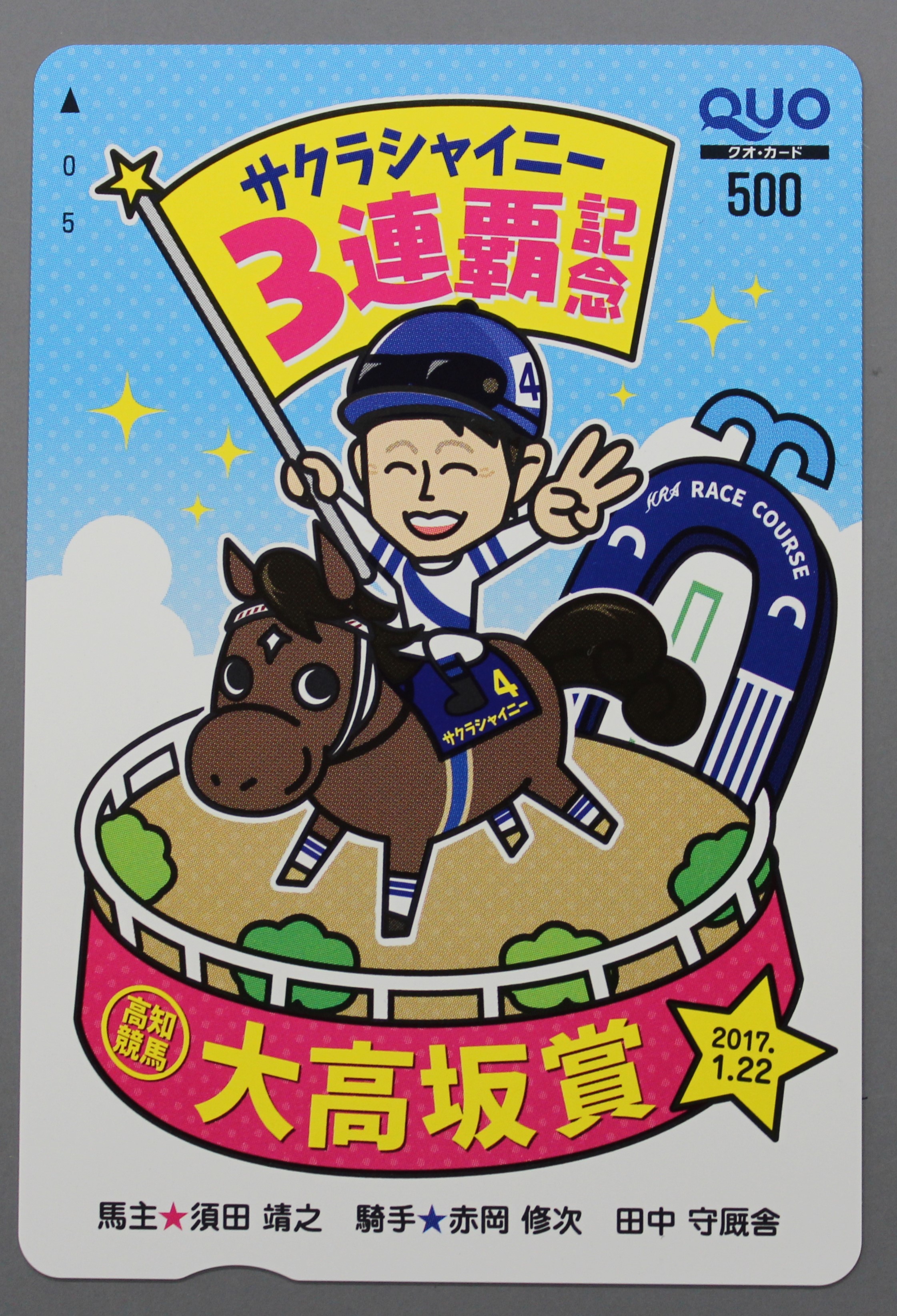 サクラシャイニー号のオーナーの須田靖之さんが大高坂賞優勝を記念して作成されたオリジナルQUOカードをファンの皆様にプレゼントしてほしいと頂きました。