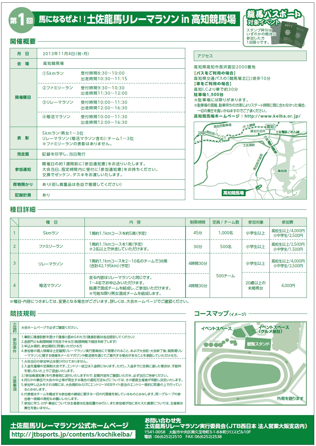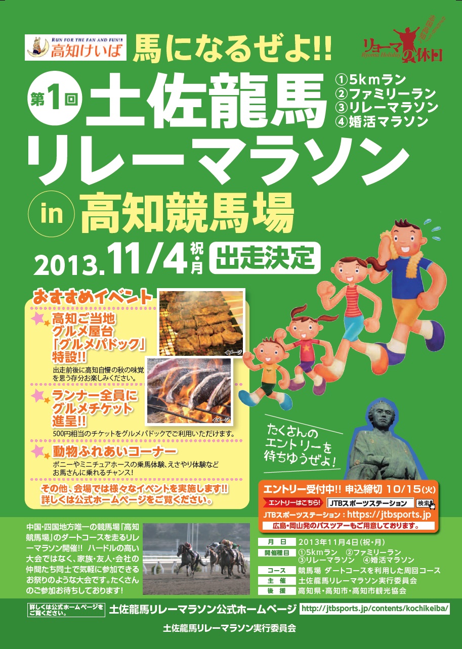 普段は競走馬が激走するダートコースを走る、「第1回土佐龍馬リレーマラソンin高知競馬場」が、ダート競馬の祭典第13回JBC(金沢競馬場)が行われる11月4日(振休・月)、下記により開催されます。