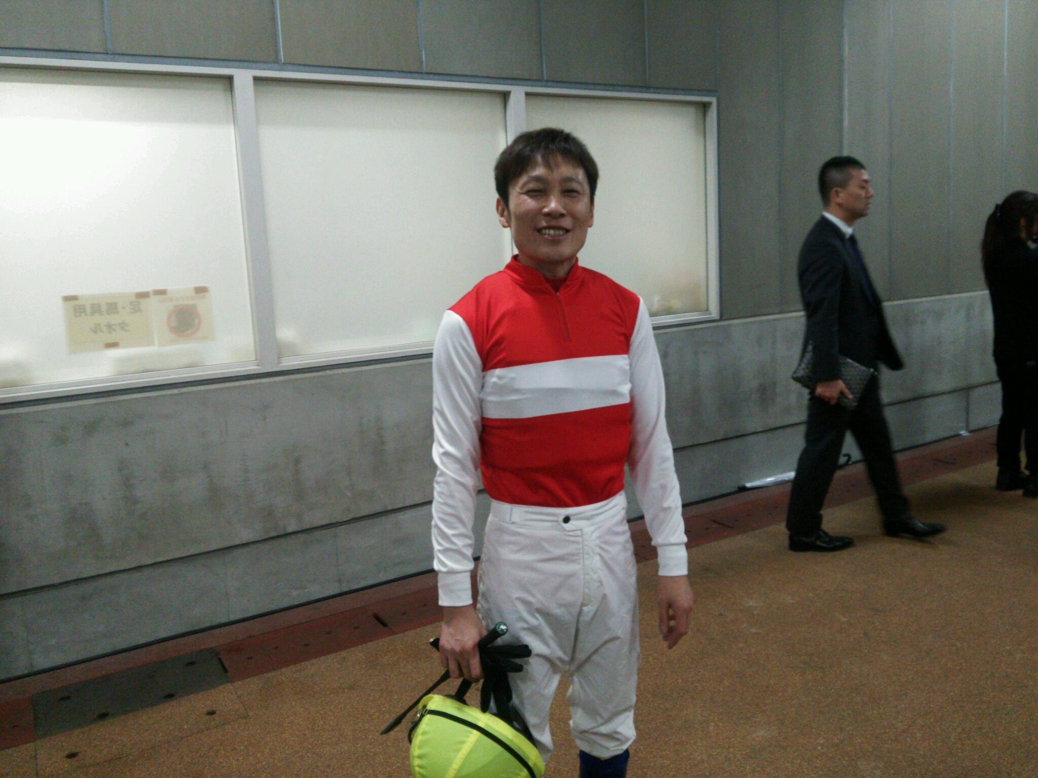 第3戦騎乗前の赤岡騎手。「ショウナン」の赤も似合います。![]()