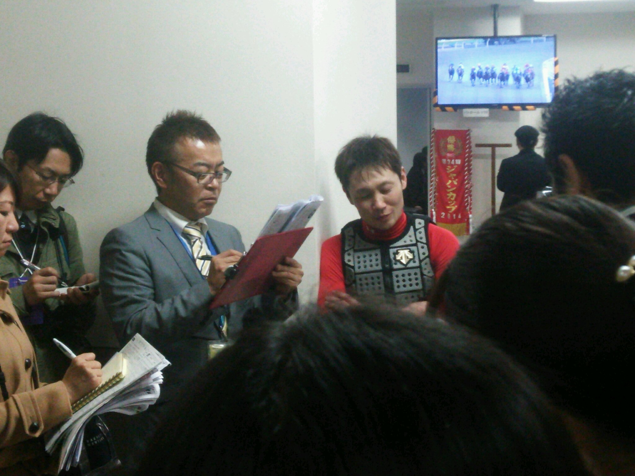 レース後、エイト松本ヒロシ氏や赤見千尋氏ら報道陣の取材に応じる赤岡騎手。