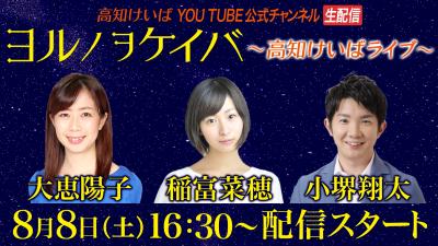 8月8日(土)から、重賞・準重賞競走実施日にYouTubeの高知けいばチャンネルにおいて、ゆる~く・楽しく・ドキドキできるライブ中継番組「ヨルノヲケイバ ~高知けいばライブ~」を配信いたします。初回の出演者は、大恵陽子さん、稲富菜穂さん、小堺翔太さんです。