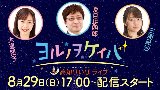 2021年8月29日のヨルノヲケイバ出演者変更 2021/8/28 ヨルノヲケイバ 8月29日のヨルノヲケイバの出演者は、大恵陽子さん、夏目耕四郎さん、三浦凪沙さんに変更となります。 2021年8月29日(日)17:00-ヨルノヲケイバ~高知けいばライブ~