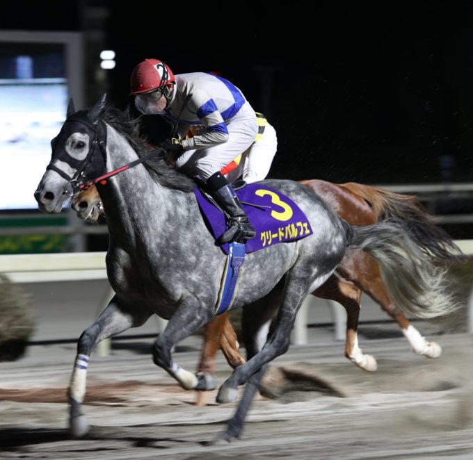 レースは、今年の3歳戦線の主役だったハルノインパクト(西川敏弘騎手)が先頭に立ち、高知県知事賞史上初めての3連覇を狙うスペルマロン(倉兼育康騎手)が続く展開となり、ゆったりとしたペースで進みました。3コーナーでスペルマロンが先頭に立ちますが、中団で脚を溜めていた7番人気のグリードパルフェ(赤岡修次騎手)が最後の直線で大外から一気に差し切り、2着スペルマロンに1馬身半の差をつけ重賞初制覇となりました。管理する田中守調教師、鞍上の赤岡修次騎手ともに2010年のフサイチバルドル以来の高知県知事賞制覇となりました。