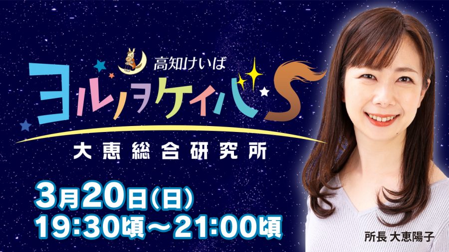 ヨルノヲケイバS~大恵総合研究所~ 2022/3/6 ヨルノヲケイバ ゆる~く、楽しくみんなで高知けいばを楽しみましょう! ヨルノヲケイバS・大恵総合研究所【3/20(日)19:30頃~21:00頃】 3月20日は、ヨルノヲケイバでお馴染みの大恵陽子さん(大恵総合研究所所長)が出演する「ヨルノヲケイバS・大恵総合研究所」を配信予定。大恵陽子さん(大恵総合研究所所長)が様々なデータを駆使して、最終レース「一発逆転ファイナルレース」の攻略に挑みます。是非、高知けいばのYouTubeチャンネルを登録してお楽しみください!