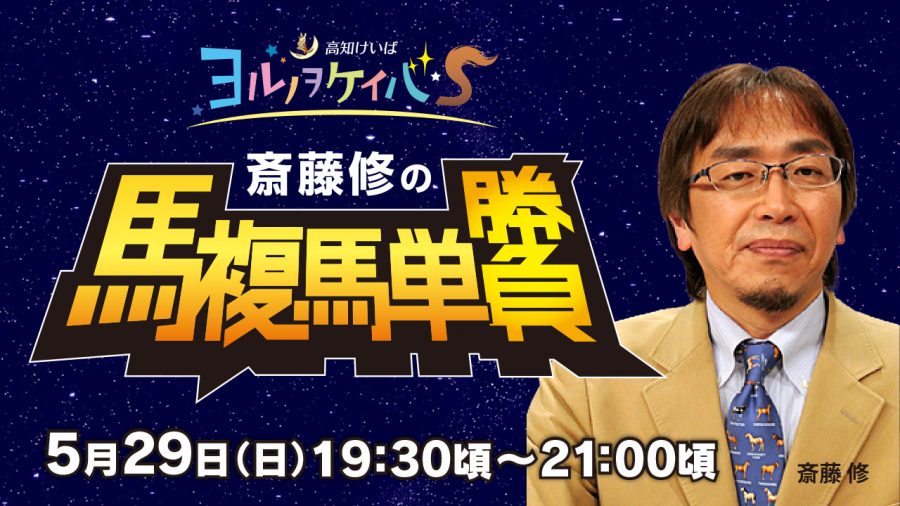ヨルノヲケイバS~斎藤修の馬複馬単勝負~ 2022/5/2 ヨルノヲケイバ ゆる~く、楽しく、ドキドキできる馬券予想とレース中継。みんなで高知けいばを楽しみましょう! ヨルノヲケイバS~斎藤修の馬複馬単勝負~【5/29(日)19:30頃~21:00頃】 5月29日は、ヨルノヲケイバでお馴染みの競馬アナリスト斎藤修さんが出演する「ヨルノヲケイバS~斎藤修の馬複馬単勝負~」をライブ配信します。 「なぜ馬複、馬単で絞って勝負する事が多いのか」を解説しながら、最終レース「一発逆転ファイナルレース」を予想します。是非、チャンネル登録してお楽しみください!