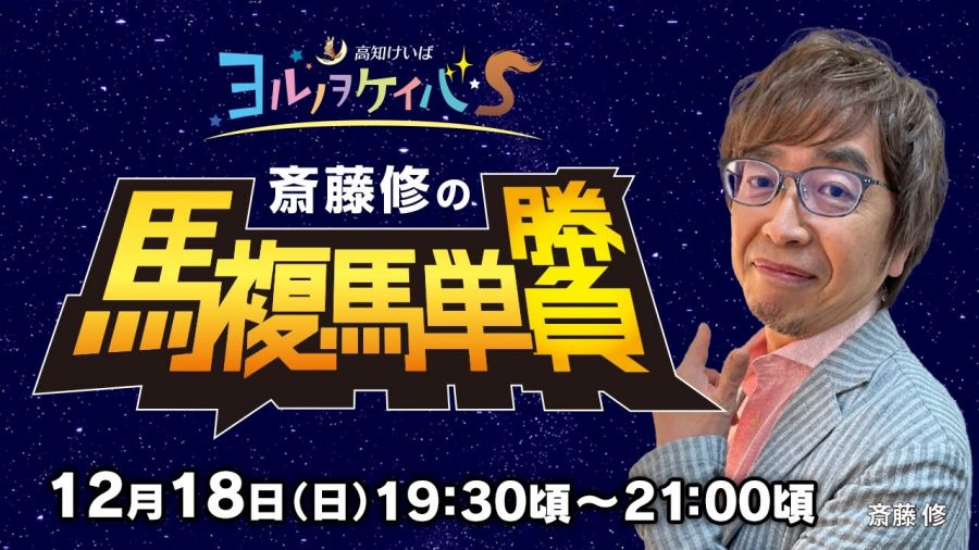 ヨルノヲケイバS~斎藤修の馬複馬単勝負~ 2022/12/17 ヨルノヲケイバ ゆる~く、楽しく、ドキドキできる馬券予想とレース中継。みんなで高知けいばを楽しみましょう! ヨルノヲケイバS~斎藤修の馬複馬単勝負~【12/18(日)19:30頃~21:00頃】 ヨルノヲケイバでお馴染みの競馬アナリスト斎藤修さんが出演する「ヨルノヲケイバS~斎藤修の馬複馬単勝負~」をライブ配信します。 「なぜ馬複、馬単で絞って勝負する事が多いのか」を解説しながら、最終レース「一発逆転ファイナルレース」を予想します。是非、チャンネル登録してお楽しみください!