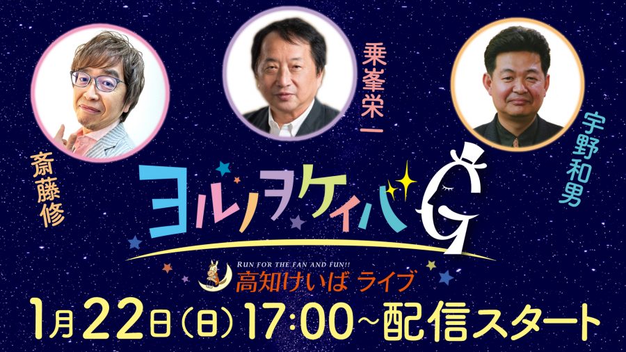ヨルノヲケイバG~高知けいばライブ?~ 2023/1/10 2023/1/20 ヨルノヲケイバ ゆる~く、楽しく、ドキドキできる馬券予想とレース中継。みんなで高知けいばを楽しみましょう! ヨルノヲケイバG~高知けいばライブ?~【1/22(日)17:00頃~21:00頃】 競馬界で長きにわたって活躍している方々が出演するヨルノヲケイバGを生配信。 競馬にまつわる思い出話やベテランならではの馬券予想を披露しながら、ゆる~い競馬番組を配信いたします。 是非、高知けいばのYouTubeチャンネルを登録してお楽しみください! ※諸事情により出演者が変更となりました。