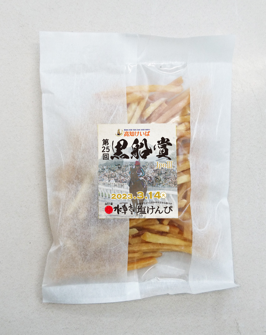 高知けいばオリジナル「塩けんぴ」プレゼント! 2023/3/3 プレゼント 3月14日(火)「農林水産大臣賞典 第25回黒船賞(JpnⅢ)」まで、あと11日。3月5日(日)、6日(月)、7日(火)の高知けいば開催日に高知けいばをお楽しみいただき18時30分以降にお帰りのお客様に、高知けいばオリジナル「塩けんぴ」をプレゼントします。 日時:3月5日(日)、6日(月)、7日(火) 18時30分~閉門まで 場所:高知競馬場 入場口 ※「塩けんぴ」はお一人様おひとつ。無くなり次第終了とさせていただきます。 高知けいばと水車亭(四万十町)コラボ 高知けいばオリジナル「塩けんぴ」