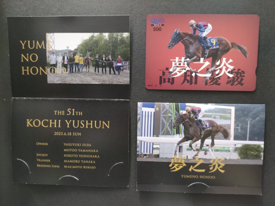2023年6月18日「第51回高知優駿(ダノンキングリー賞)」を制したユメノホノオ号のオーナーである須田靖之様より勝利記念オリジナルQuoカードをご提供いただきましたので抽選で10名様にプレゼントいたします。