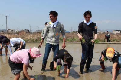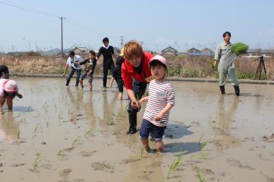 南国市の吉本正仁さんの田んぼで,騎手と高知市子ども劇場の子供たちが3グループに分かれ,手植えと田植機に乗っての田植え体験、南国市消防団・消防署のご協力による放水体験をしました。