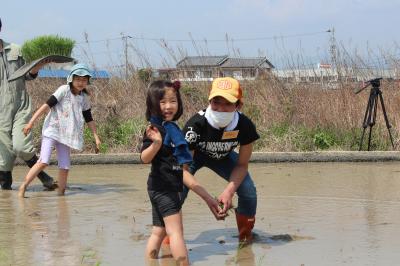 騎手・子ども達ともに田んぼに足を取られながら田植えをしたり、放水体験を楽しんでいました。